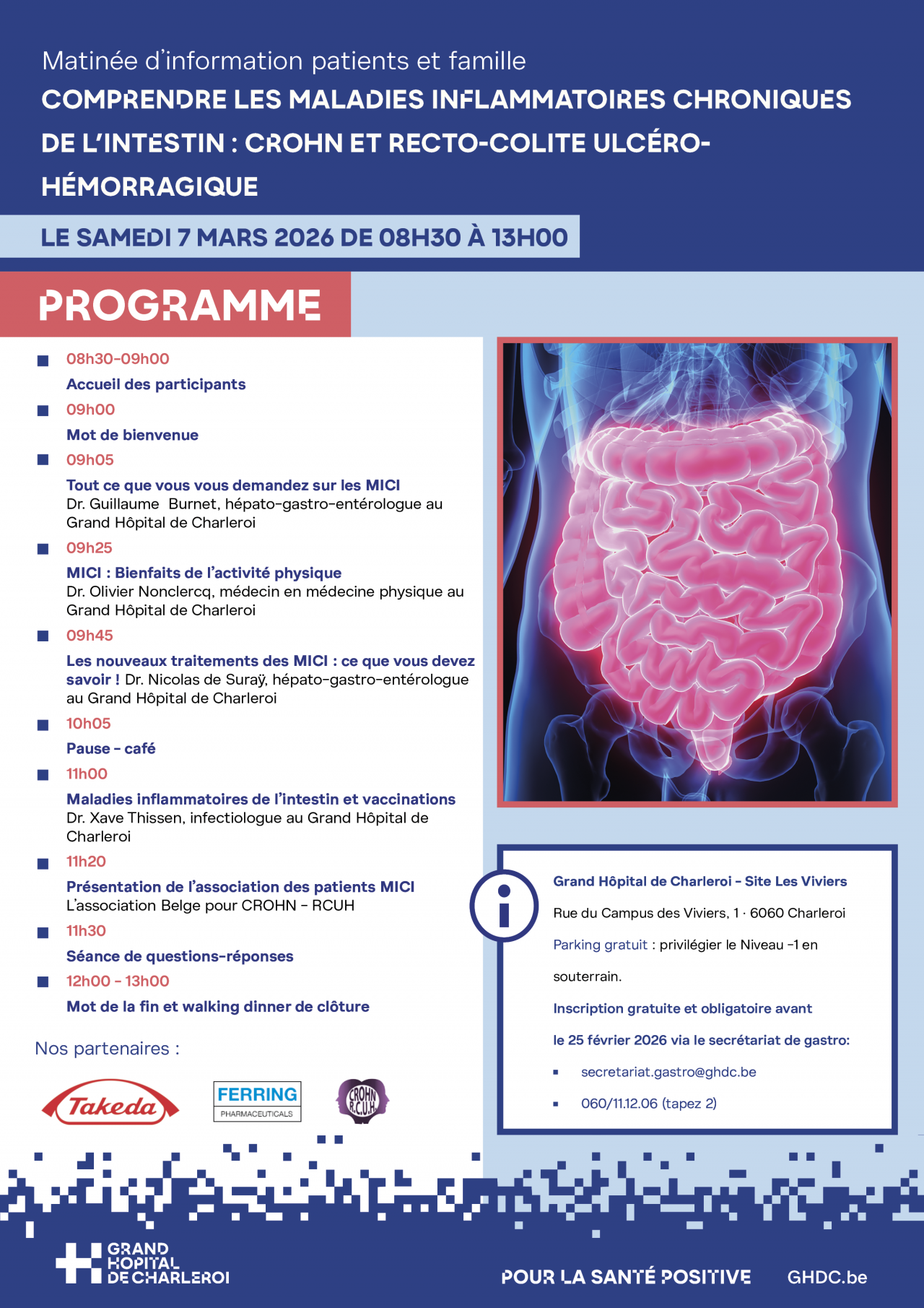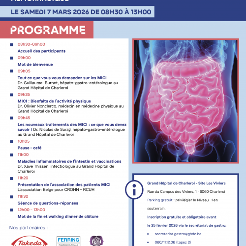 - 09h05 - Tout ce que vous vous demandez sur les MICI Dr. Guillaume Burnet, hépato-gastro-entérologue au Grand Hôpital de Charleroi