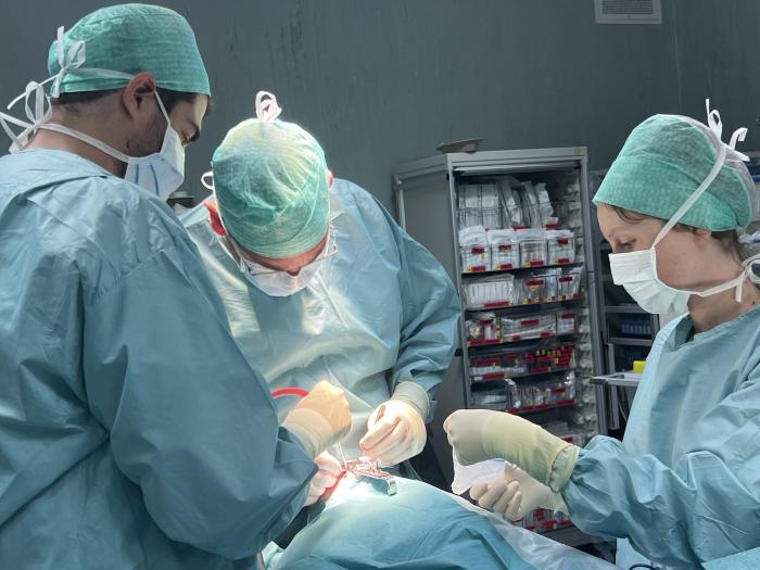 Equipe : Dr Fabrice Corbisier et Dr Raffael Calicis, chirurgiens bariatriques, Dr Julien Cornet, anesthésiste, Christel Harmel, infirmière instrumentiste et Jessica Campitelli, infirmière référente en robotique, supervisés par le Dr Simon van de Vrande, chirurgien bariatriqu